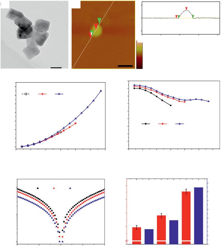 Figure 1.3 (a) TEM image of 2D TiO2 nanofillers, (b) atomic force microscopy (AFM) image of 2D TiO2 nanofillers and corresponding surface morphology of the selected line, (c) discharged energy density, (d) charge/discharge efficiency, (e) leakage current density, and (f) electrical breakdown strength of the PVDF/TiO2 composites with 5 wt% of 0D, 1D, and 2D TiO2 nanofillers. Source: Zhu et al. [41]. Reproduced with permission of American Chemical Society.