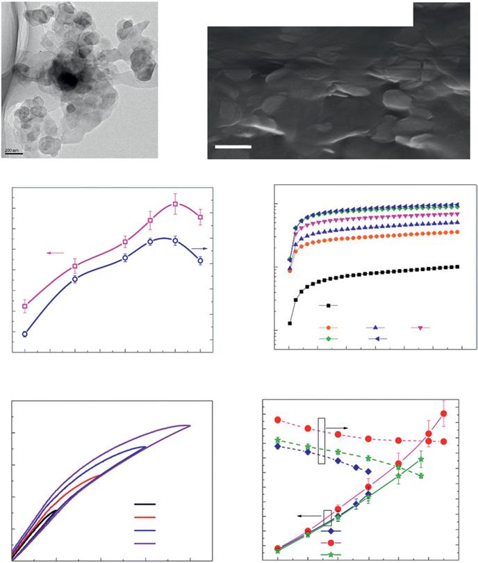 dielectric constant but also suppress the dielectric loss, which is desirable for electrical energy storage application (Figure 1.3). Because the 2D TiO2 nanofillers can effectively suppress the charge carrier transport, the leakage current of the composite with 2D TiO2 nanofillers is only a half of that of the composite with 0D TiO2 nanofillers. The composite with 2D TiO2 nanofillers also exhibits higher electrical breakdown strength (i.e. 566 MV/m) in comparison to that of the composite with 0D (i.e. 295 MV/m) and 1D (i.e. 382 MV/m)