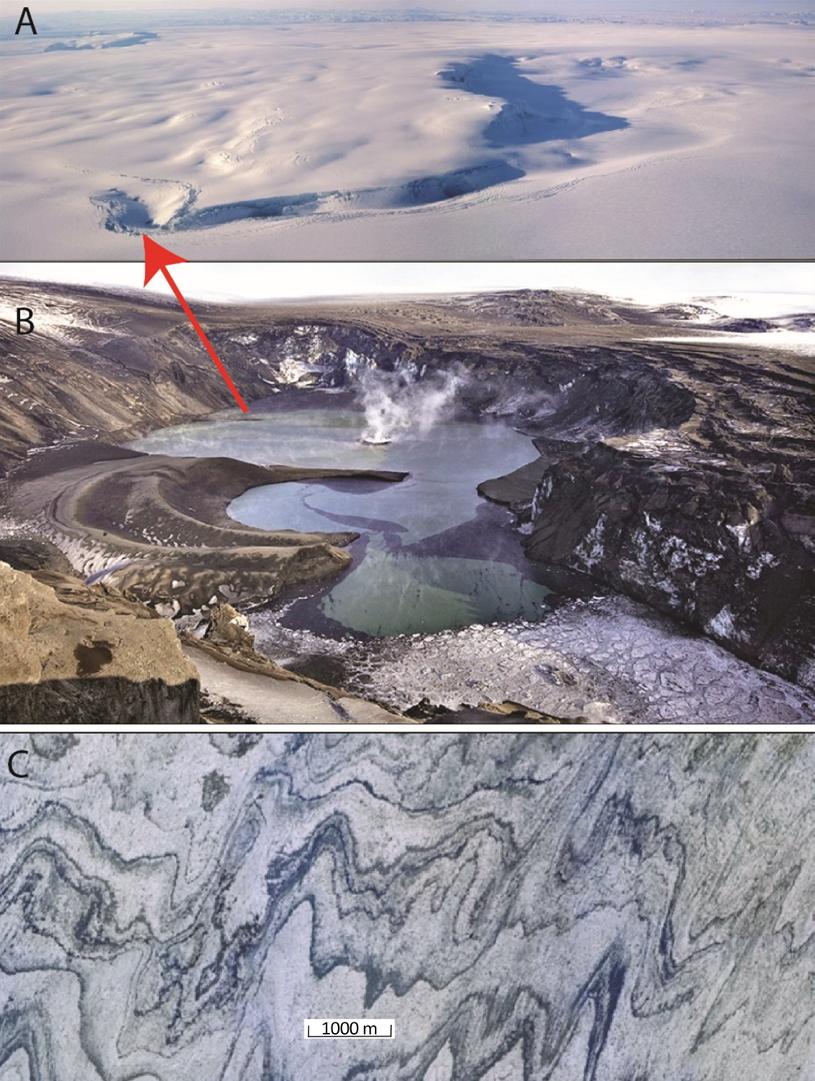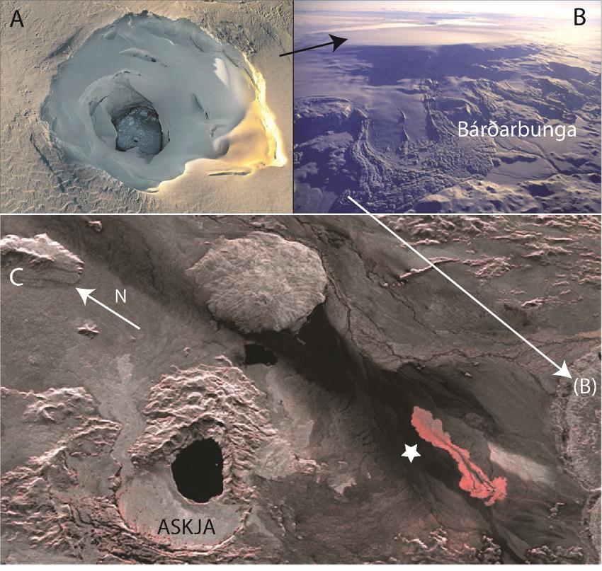 Figure I.10. (A and B) Views of the Bárðarbunga caldera obliterated by ice during the 2014 eruption with a melting cauldron to the west (A and black arrow) (photo: mbl.is/RAX). (C) Satellite image of the emersion of the Holhurhaun flow (star) on August 13, 2014 at the foot of the Bárðarbunga (B) (photo: TerraSAR-X)