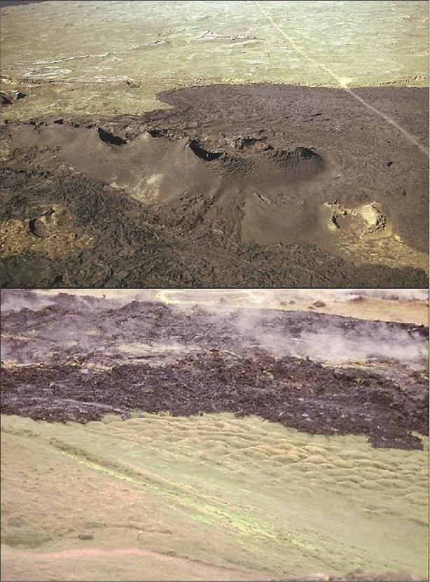 To the northwest, the most impressive lava flow since the 18th century, the Holhurhaun flow, occurred along a fracture line, in association with swarms of earthquakes that stretched to the Askja volcano in the north. The previous eruption, that of Veiðivötn, had flown toward the south in 1747, awakening the Torfa volcano at the same time.