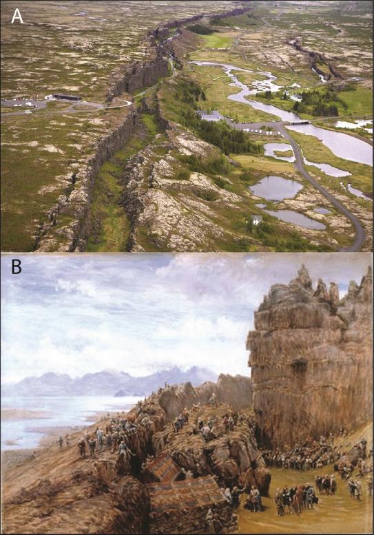 Figure I.4. (A) The Þingvellir graben, seen from an airplane (Þingvellir National Park Web site). The Alþing site is located in front of the white buildings (chapel). (B) Reconstruction of the Alþing in the Middle Ages by W.G. Collingwood (1897)