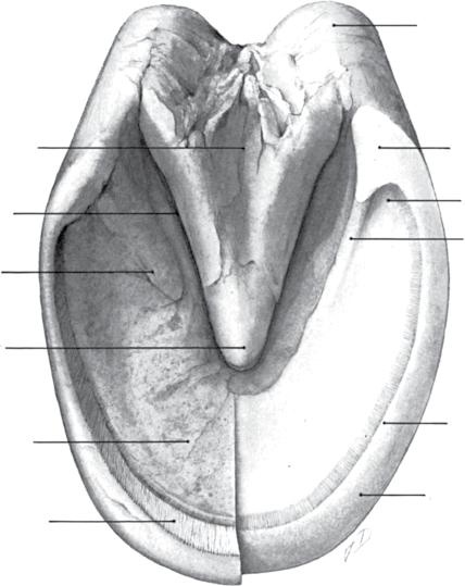The hoof is continuous with the epidermis at the coronet, and the underlying corium of the hoof is likewise continuous with the dermis of the skin. The ground surface of the hoof comprises the sole, frog, heels, bars, and ground surface of the wall (Figure 1.3). The ground surface of the forefoot is normally larger and rounder than that of the hindfoot, reflecting the corresponding shape of the distal surface of the distal phalanx (coffin bone).