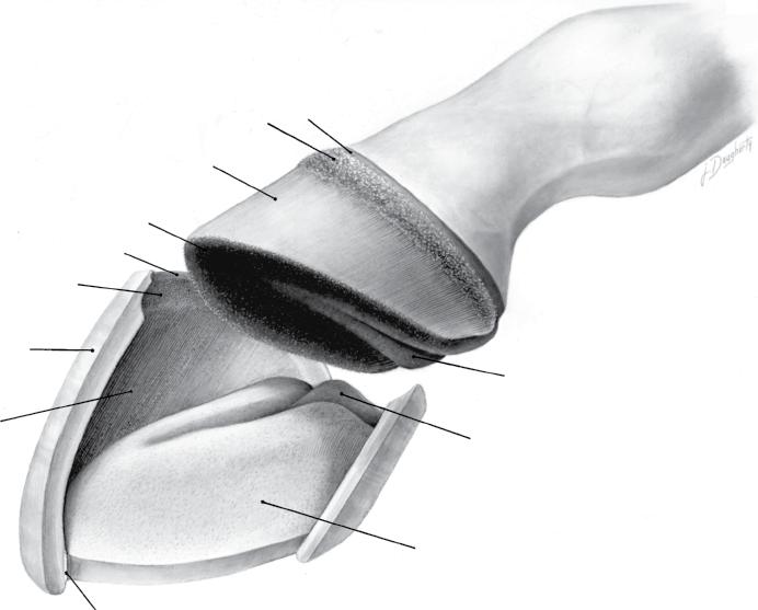 The hoof wall extends from the coronary band (also called the coronet), the transition between skin and hoof, distad to the ground. The surface of the wall is divided into the toe, medial and lateral quarters, and heels (Figures 1.3 and 1.4). From the toe, where it is thickest, the wall becomes progressively thinner and more elastic toward the heels, where it thickens again when it reflects to become the bars. Ranges for the angle of the toe between the dorsal surface of the hoof wall and the ground surface of the hoof vary widely.1,16 In the ideal digit, the dorsal surface of the hoof wall and the dorsal surface of the pastern should be parallel, reflecting the axial alignment of the phalanges.