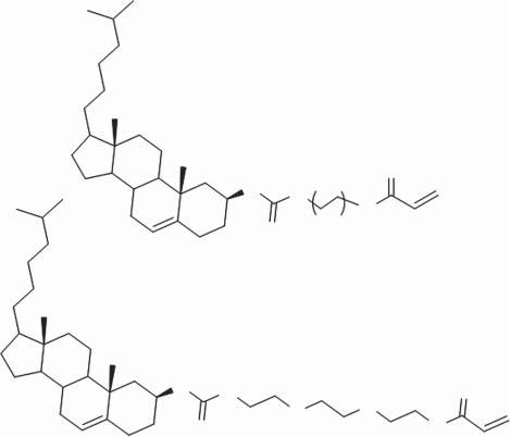 Toavoidtheeffectofunreactedstabilizer(moleculargelator)tothepolymerizedporousmaterials,severalcholesterolderivativeswithpolymerizablebonds havebeendesignedandsynthesized(Scheme1.9)[54,55].Usingthegelators asstabilizers,aseriesofW/Ogelemulsions(continuousphase:styrene;dispersedphase:water)havebeenprepared.Then,thegelemulsionswereforcedto undergopolymerizationanddrying.Accordingly,porousmaterialswithdifferent constitutionandvariedinternalstructurescanbesynthesized.Owingtothe hydrophobicnatureoftheporousmaterials,theyhavetheabilitytoadsorb VOCs(includingbenzene,toluene,ethylbenzene,andethylene)andshow higheradsorptioncapacitycomparedtothecommonlyusedadsorbents,active carbon.