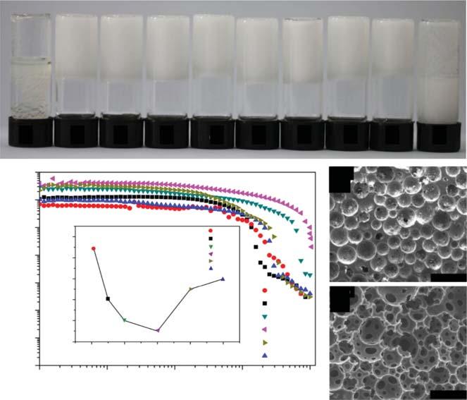 Figure1.5 Typicalgelemulsionsandporousmaterialspreparedbyusingmolecular gelatorasstabilizer.(a)Photosofthestyrenegel.Photosofgelemulsionwithdifferent amountsofstabilizer.(b)Rheologicalbehaviorsofgelemulsionswithdifferentwater contents.(candd)SEMimagesofporousmaterialspreparedfromgelemulsionswith differentamountsof n-heptaneasadditives.
