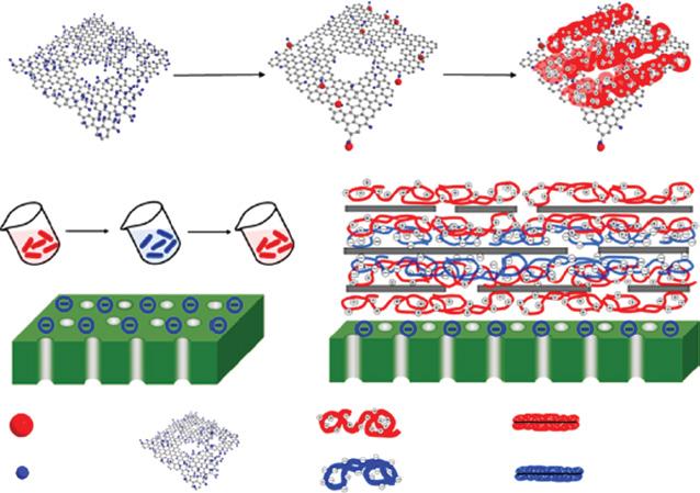 In other work, the graphene oxide framework (GOF) was designed via “from” and “to” cross-linking approaches. GOF with compact nanochannels were fabricated by LBL using branched polyethyleneimine (BPEI), GO, and thiourea particles as the well-defined