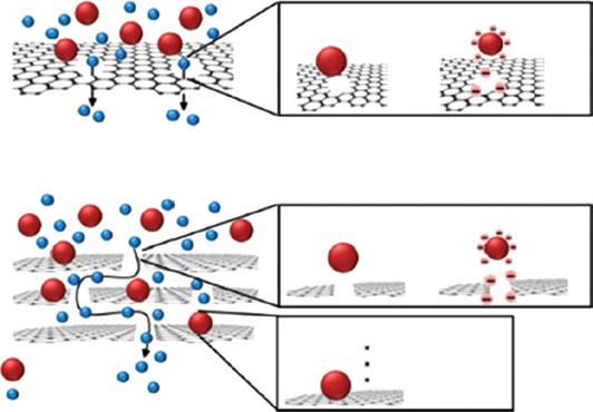 Figure 1.3 Selective permeation routes in nanoporous graphene and stacked sheets of GO. (a) Nanoporous graphene membrane and (b) stacked graphene oxide membrane.