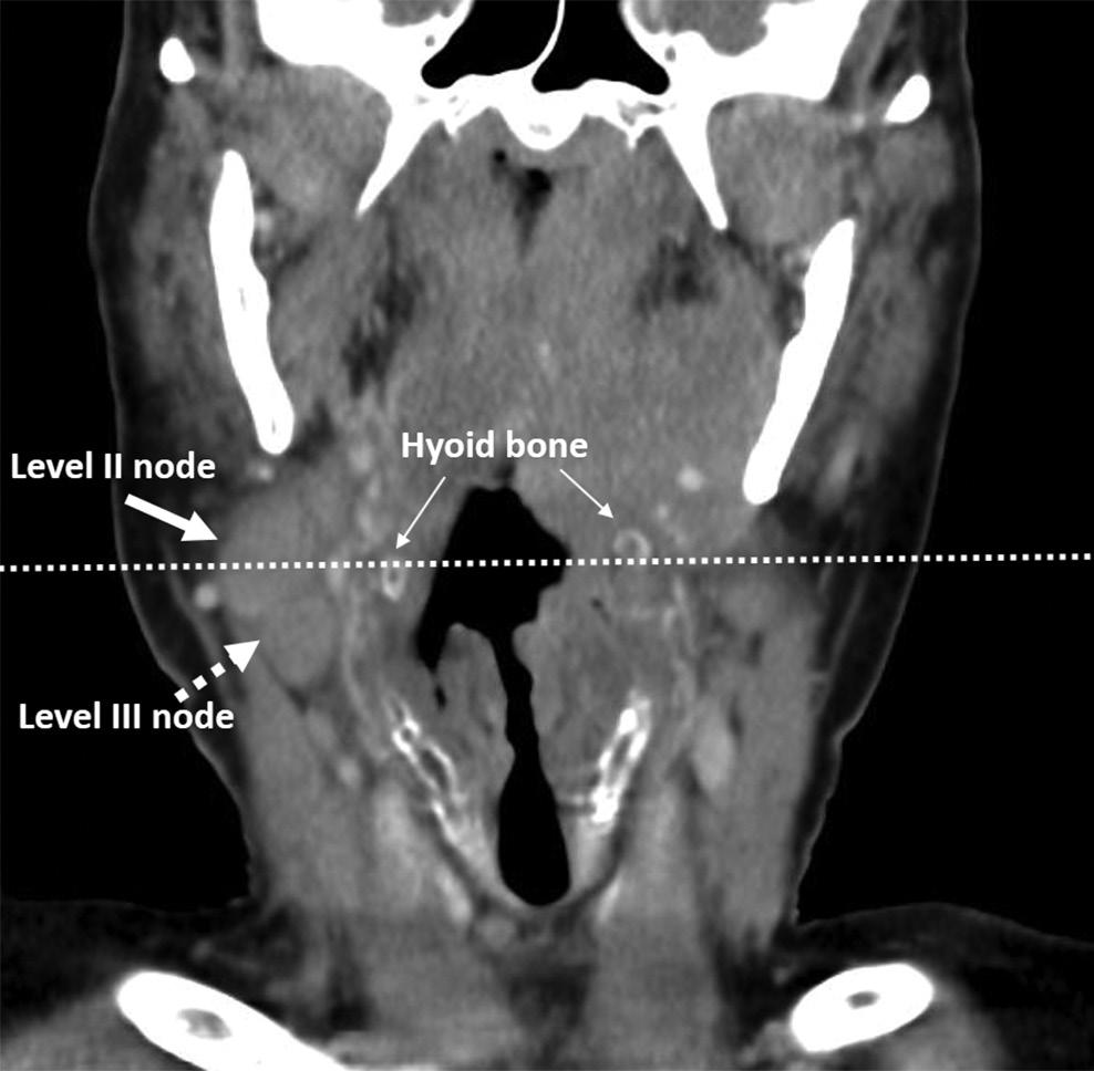 Fig. 3 Coronal CT scan showing the same enlarged right upper jugular (deep cervical) Level II lymph node measuring 2.5 cm in greatest dimension, but also an enlarged right medial jugular (deep cervical) Level III lymph node measuring 1.5 cm in greatest dimension. Horizontal plane (dotted line) delineated by the hyoid bone that defines Level II nodes superiorly from Level III nodes inferiorly is marked. This is classified as cN2b: metastasis in multiple ipsilateral lymph nodes, none more than 6 cm in greatest dimension without extranodal extension.