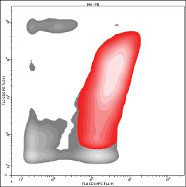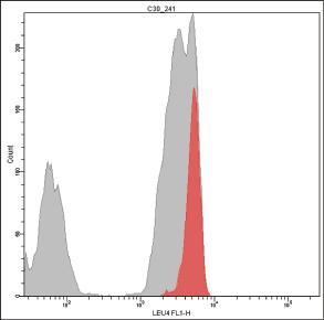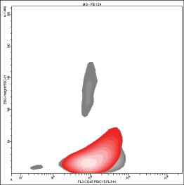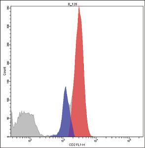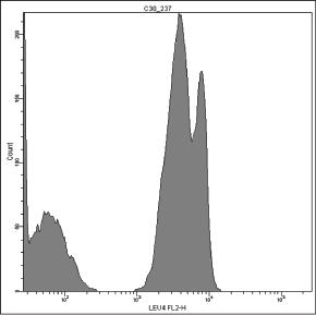 The staining of peripheral normal lymphocytes with an anti‐CD2 monoclonal antibody (MoAb) generates a positive histogram with a narrow gaussian‐like peak, clearly separated from the negative component, with a channel peak representing the presence of 24 ± 7 E03 ABC (antibody‐binding capacity) [72].