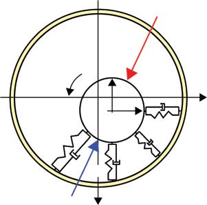 It is possible to formulate a non-linear description without the above-mentioned flaw (Kiciński 1994). This description can be based on four predefined stiffness coefficients and four damping coefficients and is used in the MESWIR environment. If the whole interval of variation of the journal trajectory is divided into a sufficiently large number of successive subintervals at small intervals of Δt, it may be assumed that there are areas of the circle of backlash corresponding to those subintervals in which the stiffness and damping coefficients are approximately constant. Each such area will have constant coefficients which need to be determined. The characteristic feature of this method of determining the stiffness and damping coefficients is the fact that for each such area the full Reynolds equation is solved with only one boundary conditions (and thus without the use of superposition solutions). The dynamic components Wx,Wy depend not only on the momentary position of the center of the journal xc, yc, but also on the speed of change of this position xc , yc , according to Eq. (1.9) (Buchacz et al. 2013).