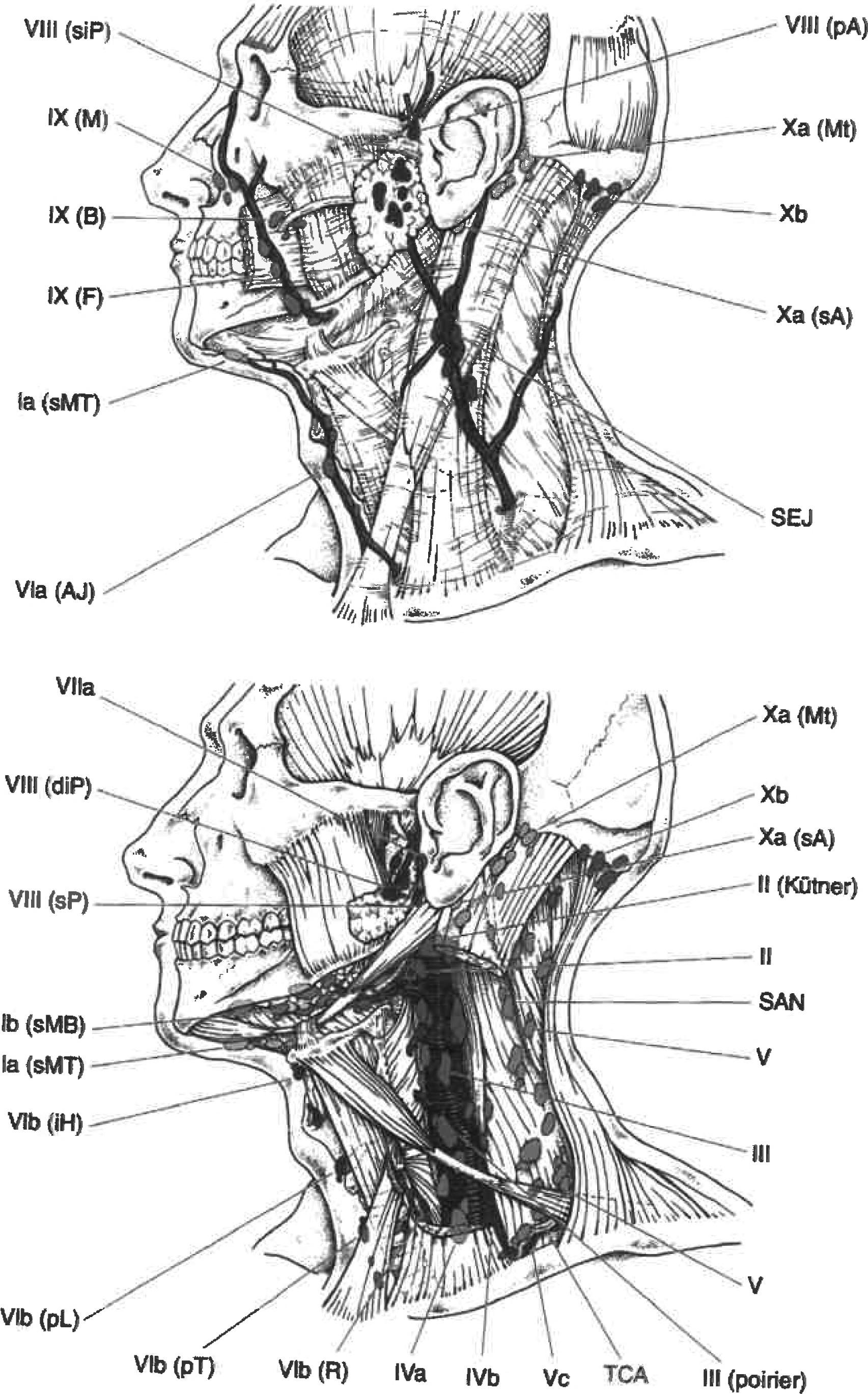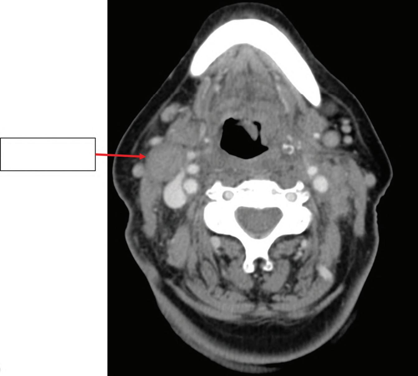 Level II lymph node with subcutaneous tissue invasion (arrow) and engulfment of ster nomastoid muscle