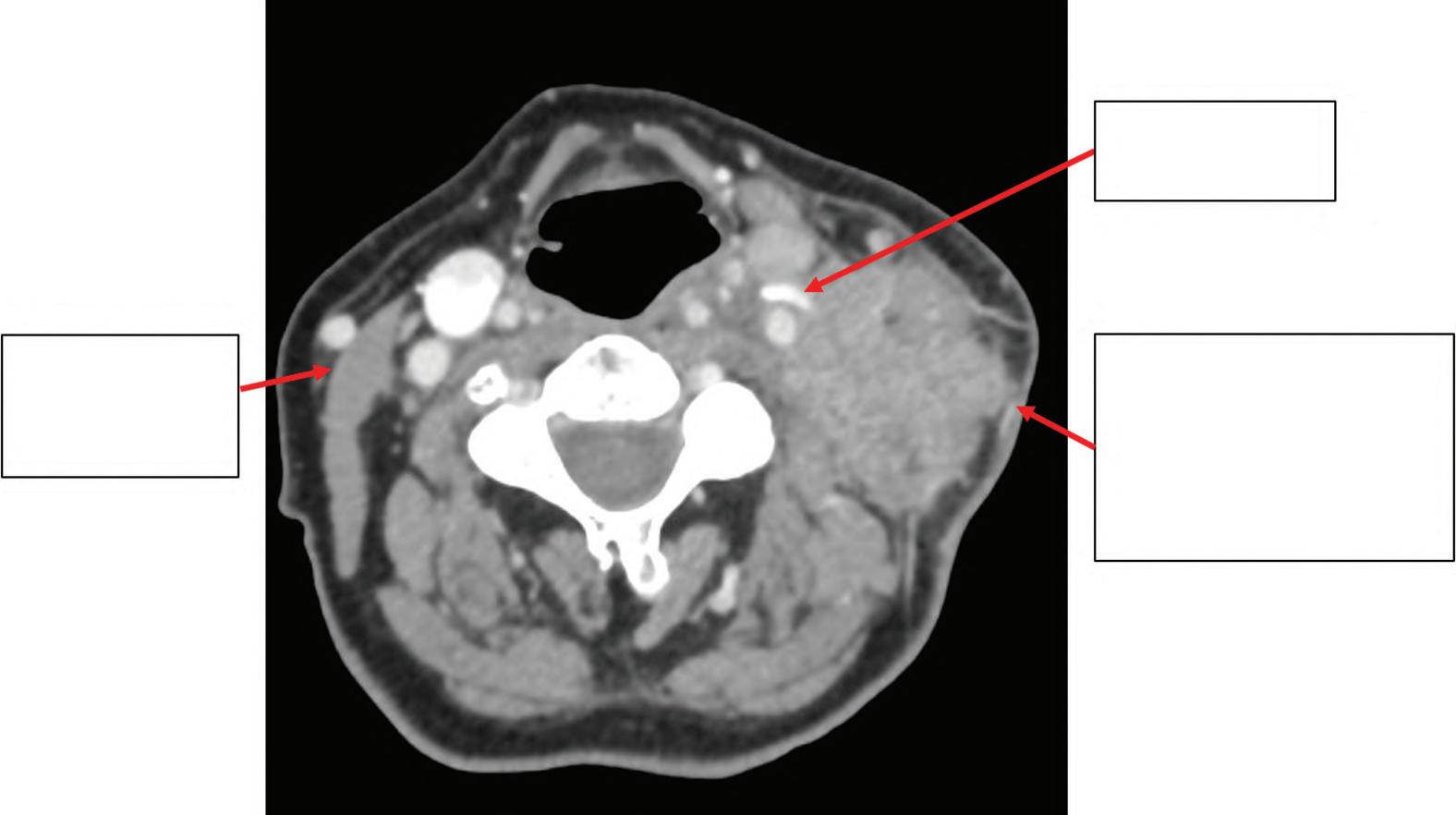 Fig. 10 Axial CT scan showing clinically fixed right upper jugular (deep cervical) Level II lymph node with subcutaneous tissue invasion, engulfment of sternomastoid muscle and encasement of the carotid artery. This is classified as cN3b.