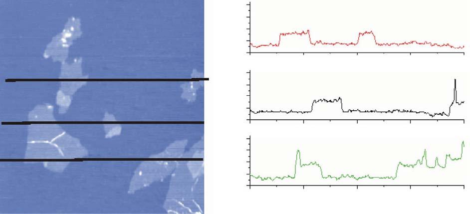 Figure1.2 AFMimageofexfoliatedgrapheneoxide(GO)sheetswiththreeheightprofilesacquiredin differentlocations.Source:Reprintedwithpermissionfromref.[5]Copyright2007ElsevierLtd.