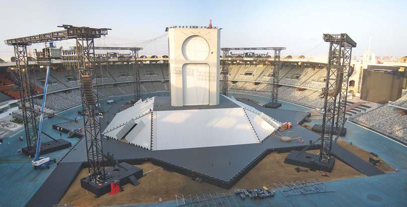 The 40-metre (130-foot) tall structure in the centre of Abu Dhabi’s Zayed Sports City Stadium stood on a 9-metre (30-foot) tall plinth, and provided over 6,000 square metres (65,000 square feet) of projection surface. The plinth housed substage storage and dressing rooms for cast and props that gained stage access via large barn doors and mechanical lifts. Four 3-metre (10-foot) wide steel portals were used for performer flying, lighting and projection positions.