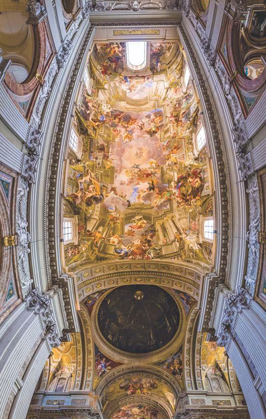 The ceiling of the church features a painted anamorphic perspective dome that appears real from certain viewpoints. This early use of illusion for theatrical effect gives the building a more majestic presence.