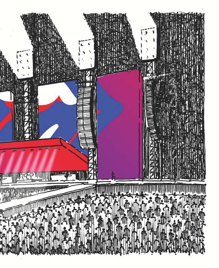 Hand sketch. The band wanted a sleek, modern look for this tour. This was achieved with four 22-metre (72-foot) monolithic LED screen towers which hid all the technical components. The band played under a custom-built roof, and all lighting fixtures were integrated into the structures, further enhancing the stage set’s elegant simplicity.