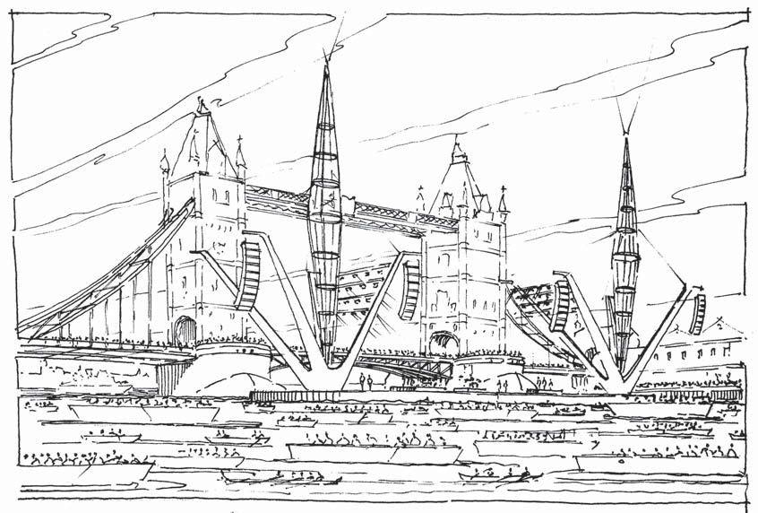 The concept illustrated is for a floating stage in front of Tower Bridge. The stage consists of a series of floating barges with mechanical arms and telescoping towers that would hold all the equipment necessary to stage a spectacular show celebrating the end of the Covid-19 worldwide pandemic.