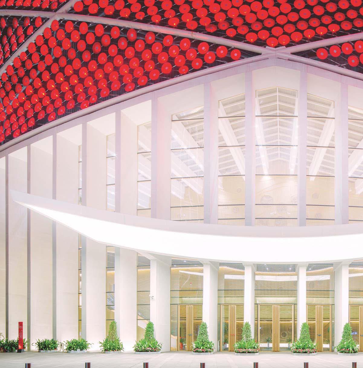 The theatre’s shape references a traditional Chinese paper lantern, its surface suggested by fine cable nets tensioned between eight intersecting steel rings, suspended around the fly tower. At the net’s 18,000 nodes, red aluminium disks support LEDs. At night, the façade seems to be created of light, dematerialising the building’s substance. Slender support columns represent the lantern’s tassels, and the podium roof profile evokes the curving profile of traditional Chinese roofs.