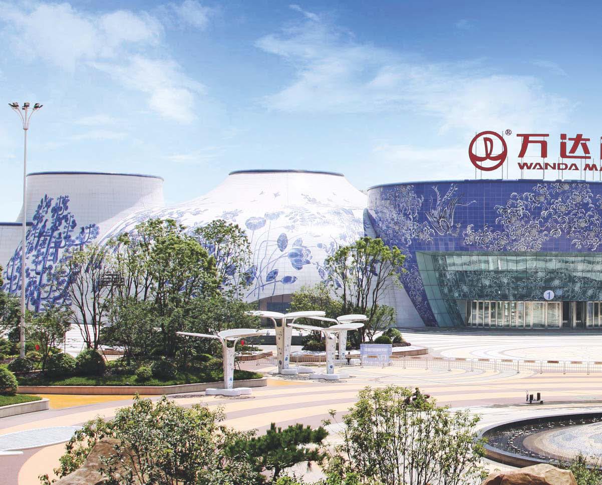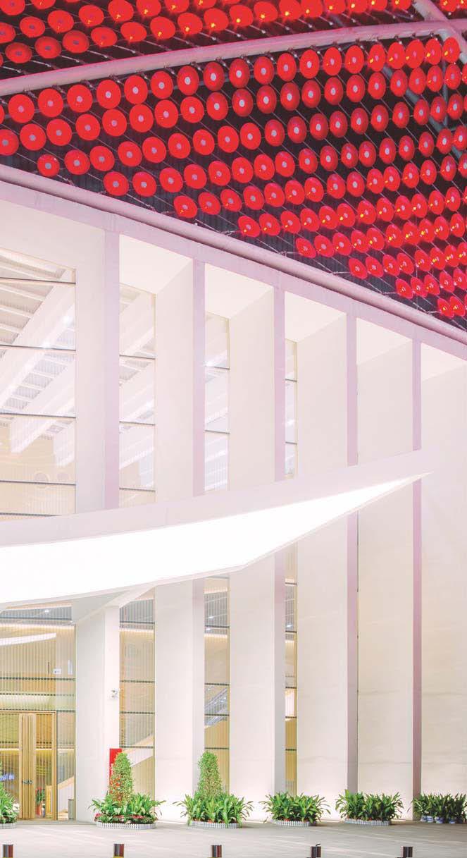 The concept for the façade is inspired by the world-famous Chinese blue-and-white porcelain, produced for over 1,000 years in the local town of Jingdezhen, Jiangxi province. The large curving three-dimensional forms of the façade break up the plaza’s volume into smaller, humanscale street frontages, and are clad in large blueand-white porcelain tiles, in characteristic floral and fantasy patterns.