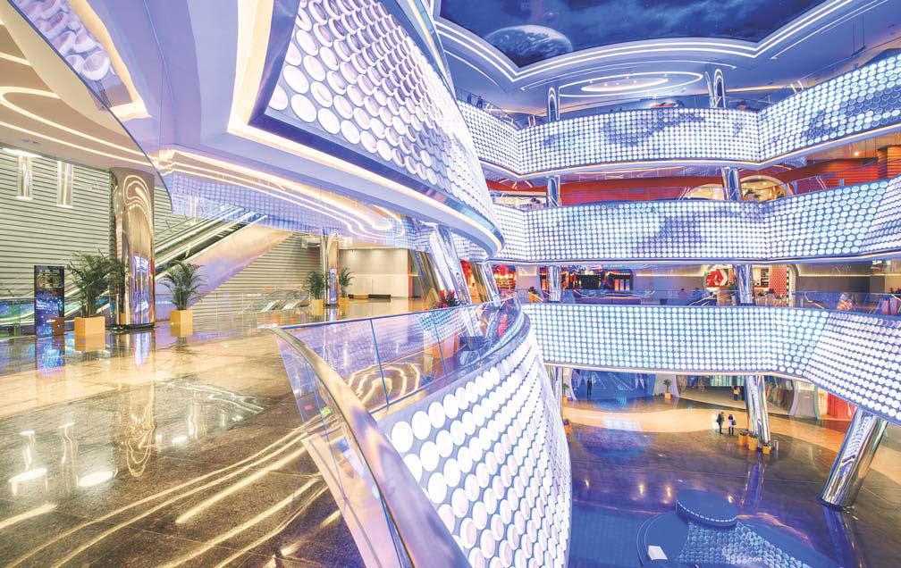 below: Animated LED discs line the Grand Atrium’s inner façade. They create an interactive digital platform displaying vibrant choreographed theatrical lighting that enhances the multi-dimensional energy of the architecture. The fully contained complex houses retail and restaurant spaces, 4K and 5K resolution cinema screens, a flight theatre and other film-related ‘ride’ attractions.