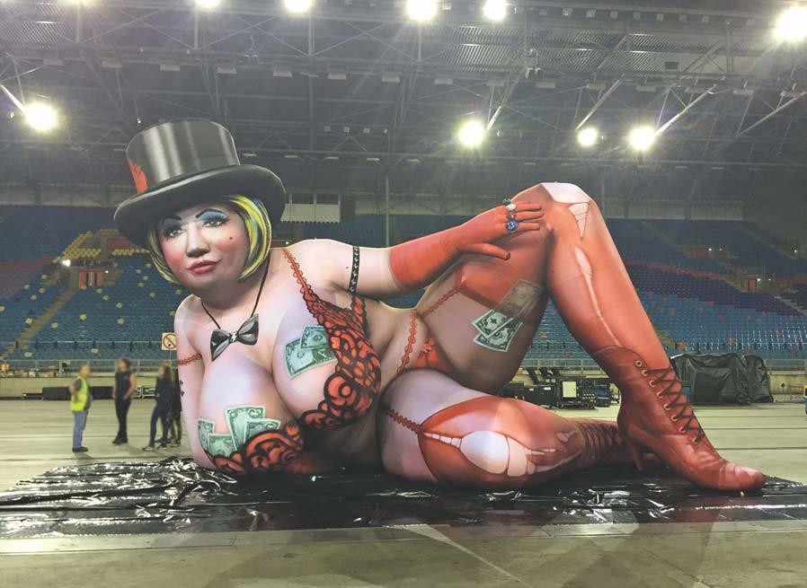 Rosie is linked to the AC/DC song ‘Whole Lotta Rosie’. Here shown on site in Arnhem, the inflatable, fabricated by Airworks Amsterdam, is approximately 10 metres (33 feet) wide by 6 metres (20 feet) tall, and is used as a stage prop during AC/DC’s touring shows, appearing when her eponymous song is played.