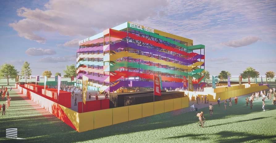 opposite: Concept render of the exterior showing the theatre’s colourful, well-ventilated façade and transient, reconfigurable construction.