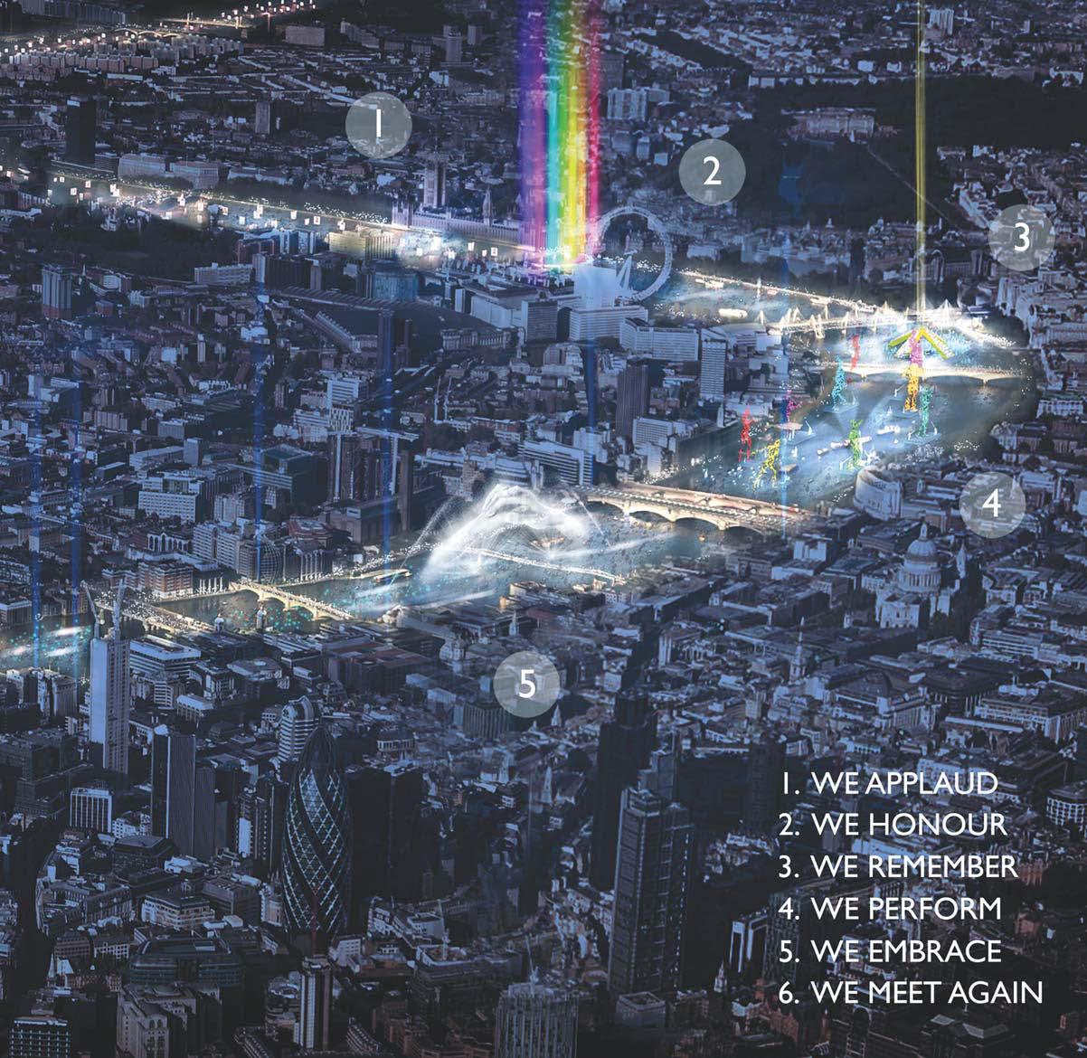 ‘We Meet Again’ (2020) is posited for a near-future time where Covid-19 has been vanquished. It takes its initial inspiration from London’s Thames River pageant tradition where processions of boats progress up or down the river to celebrate historical events, the last one in 2012 for the Queen’s Diamond Jubilee. It consists of six elements. ‘We Applaud’ has 200 floating video screens starting at Hampton Court and finishing at Parliament and St Thomas’s Hospital. The screens show the faces of firefighters, soldiers and NHS personnel, culminating in a ritual public applause. ‘We Honour’ is a rainbow light installation centred on Westminster Bridge to celebrate our enhanced community spirit through lockdown, and ‘We Remember’ a choir raised above the river with floating, dissolving candles –a time for remembrance. At the South Bank, ‘We Perform’ is a series of large, lit floating barges of giant sculptures of performers of all sorts. ‘We Embrace’, along Hungerford Bridge, is formed by a mist within which can be seen two hands holding, and finally ‘We Meet Again’ is a circular stage at Tower Bridge with live performance and a halo of flying drones to create the light show. STUFISH have consciously enlarged this entertainment architecture to an urban scale where the river is the stage and the city is the audience.