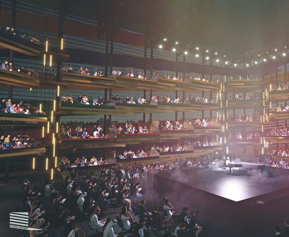 below: Render of the interior illustrating a performance in progress. The Vertical Theatre is designed as an intimate, travelling venue that disappears without a trace when the show is over.