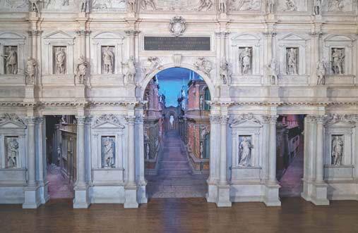 Other notable works include Andrea Palladio and Vincenzo Scamozzi’s Teatro Olimpico in Vicenza (1585) with its trompe-l’oeil stage backdrop giving the illusion of its streets stretching into the distance when seen by the audience through the Roman-styled scaenae frons It is the oldest stage set that survives.