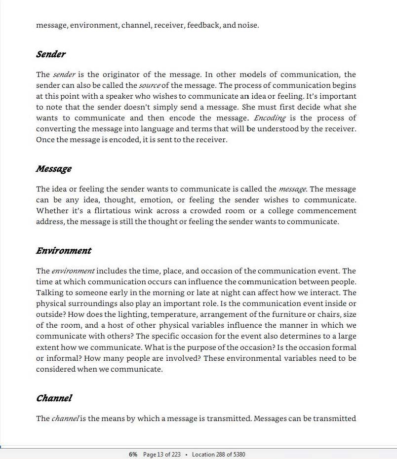 The environment includes t he time, place, and occasion of the communic at ion event. The time at w hich communication occurs can influence t h e communication between people. Tal king to someone ear l y in the morning or late at night can affect ho w we inter act . The p h ys ic a l surroundings a lso play an important ro le. Is the communication event in s ide or outside? How does the li g htin g, temperature, arrangement of t he furniture or chairs, s ize of t he room, and a h ost of other physical vari ab les influence t h e manner in w hich we communicate w i t h others? The spec ific occasion for the event a lso determ ine s to a large extent ho w we communicate. Wh at is the purpose of t he occas ion ? Is the occas ion forma l or in formal ? Ho w many people are invo l ved? The se environmental var iable s need to be considered w hen we communicate.