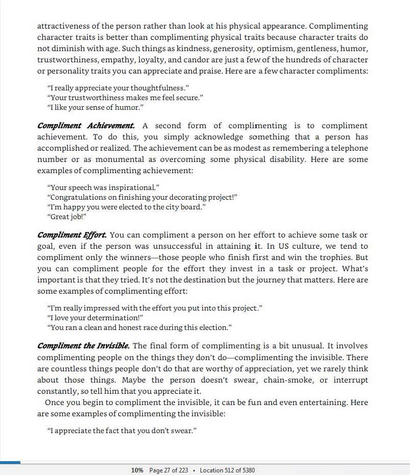 Compliment tile Invisible. The final form of complimenting is a bit unusual. It invo l ves complimenting people on the things they don't do- complimenting the invisib le. There are countless th i ngs people don't do that are worthy of appreciation, yet we rare l y think about those things. Maybe the person doesn ' t swear, chain-smoke, or interrupt constantl y, so te ll him that you appreciate it.