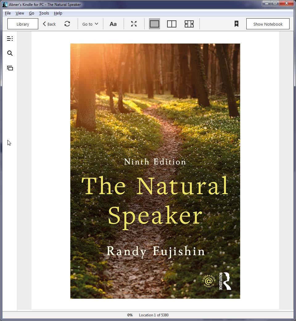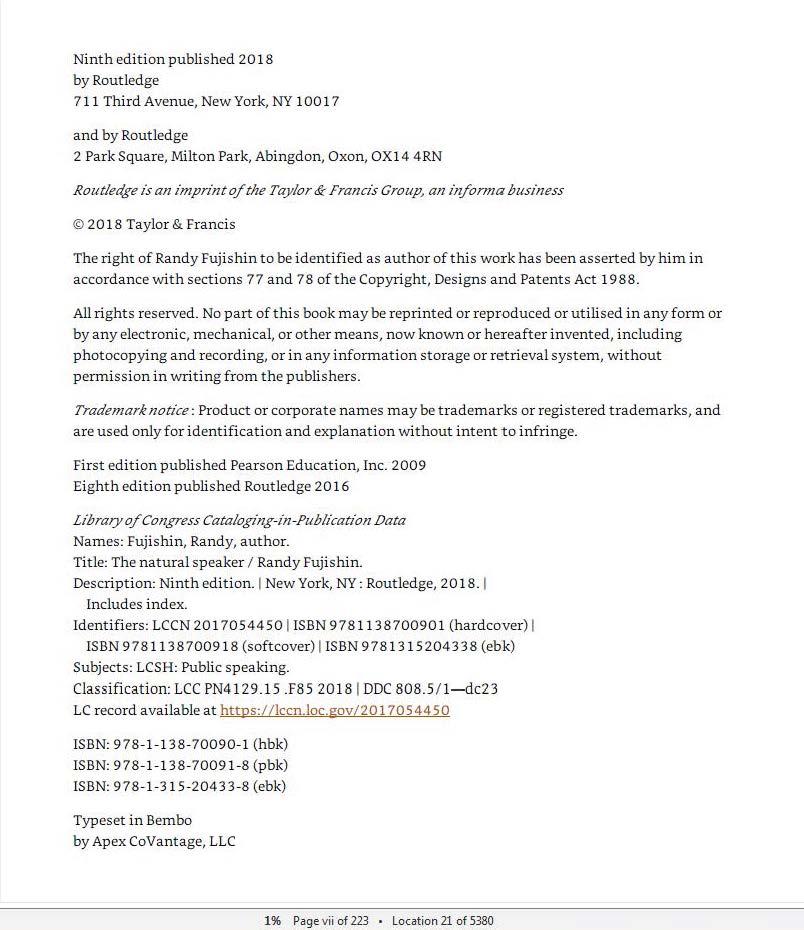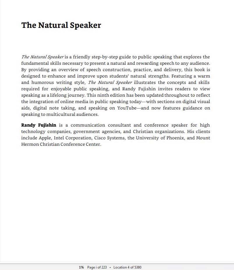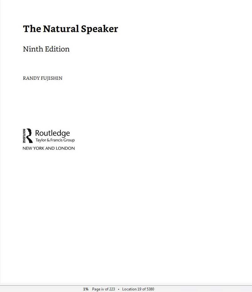 The Natural Speaker is a friend l y step-by-step guide to public speaking that explores the fundamenta l skills necessary to present a natural and rewarding speech to any audience . By providing an overview of speech construction, practice, and de livery, this book is des igned to enhance and impro ve upon students' natural strengths. Featuring a warm and humorous writing sty le, The Natural Speaker illustrates t he concepts and skill s required for enjoyab le public speakin g, and Randy Fujish in in vites readers to view speaking as a life long journey. This ninth edition h as been updated t hroughout to reflect the integration of online media in public speaking today- with sections on dig ital visual aids, d igital note taking, and speaking on YouTube - and now features guidance on speaking to mu l ticultural audiences.