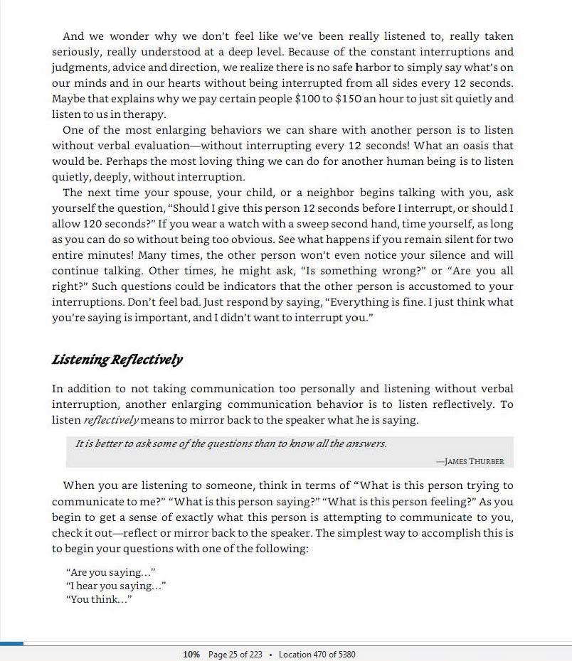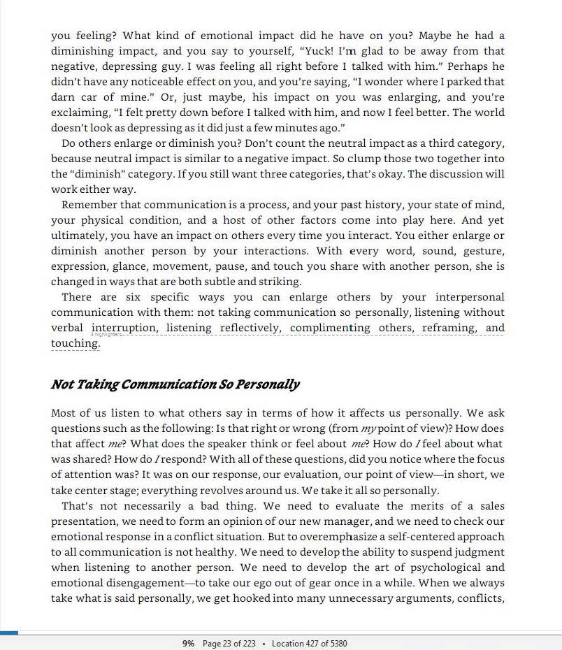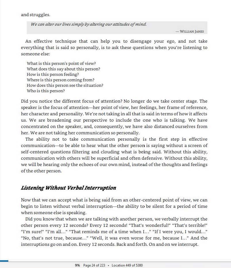 The ab ility not to take communication personall y i s the first step in effective communication- to be ab le to he ar w h at the other person is sayin g w ithout a screen of se lf-ce ntere d question s fi l tering and cloudi ng w h at is be ing said. Wi thout this ab ility, communic at ion w ith other s will be s uper fic ial and o ften defe n s i ve. Without this ab il i ty, we will be he a ring onl y the echoes of our o wn mind, instead of the thoughts and fee lings o f t he othe r perso n .