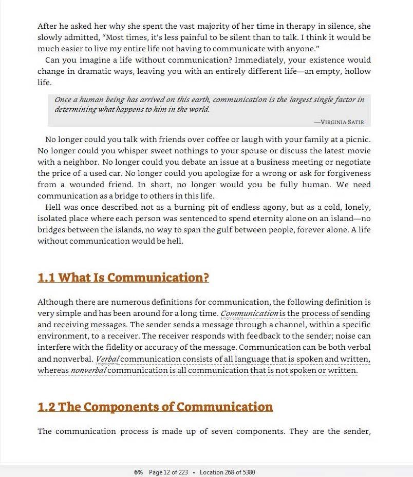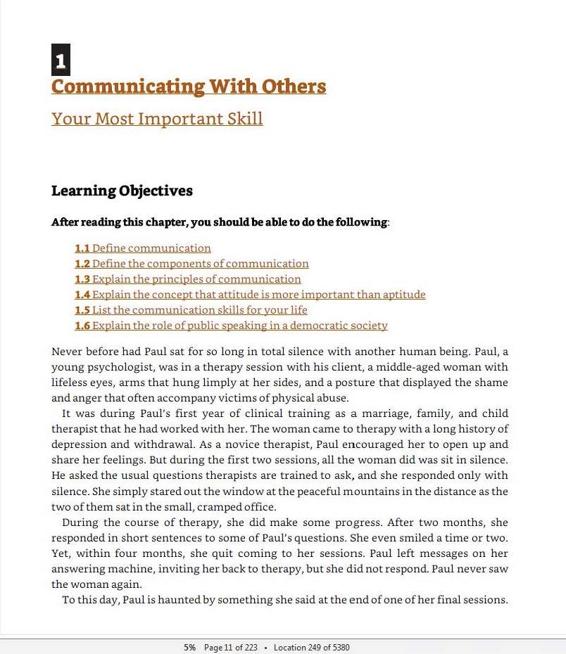 Ch apters 1 and z explore t h e nature and principles of communication, your communication attitude, and six interpersonal communication skills that are vital to effective communication in your everyday life. You will a lso be encouraged to give yourself permission to grow in a ll these areas. Chapter 3 will introduce you to t h e basic components of speech organization.