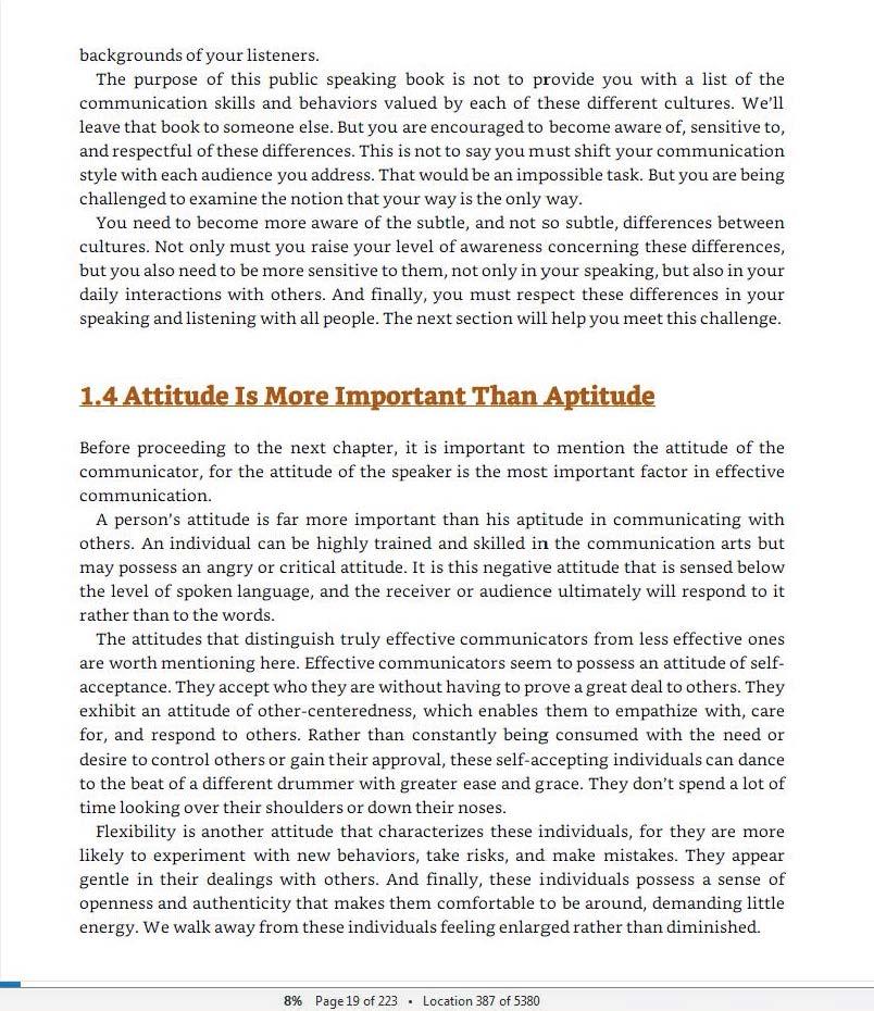 The purpose of this public speaking book is not to pro v ide y ou with a list of the communication skills and behav iors v a l ued b y each of these different cultures. We ' ll leave that book to someone else. But you are encouraged to become aware of, sensitiv e to, and respectful of these differences. This is not to say you must shift y our communication sty le with each audience y ou address. That would be an impossib le task. But you are being challenged to examine the notion that your way is the onl y way.