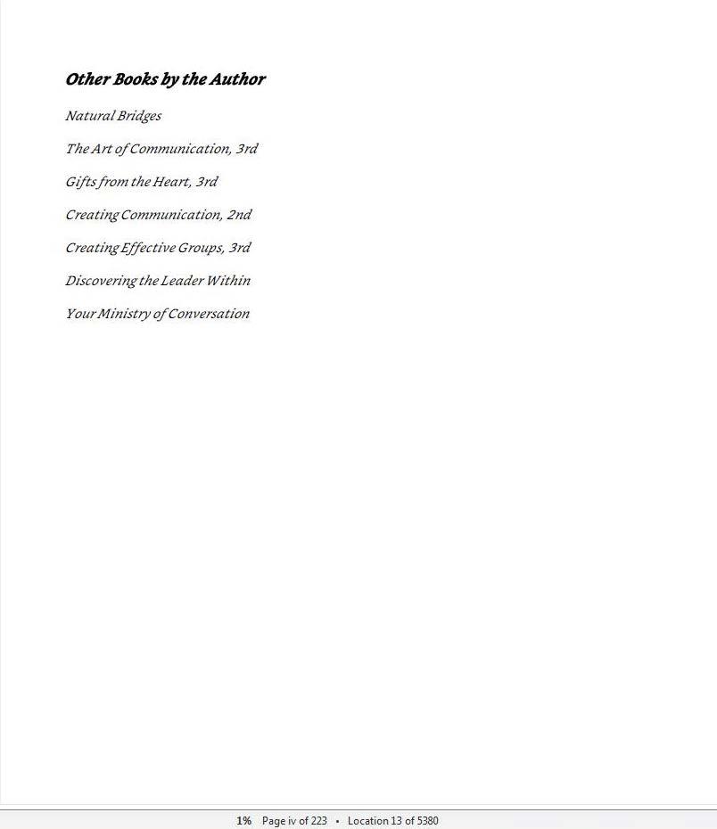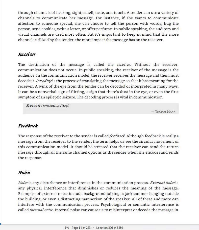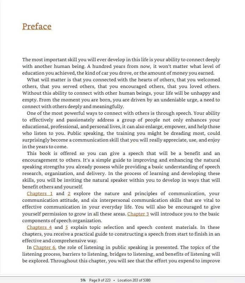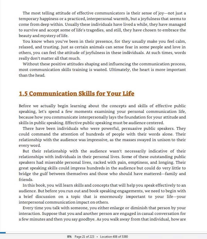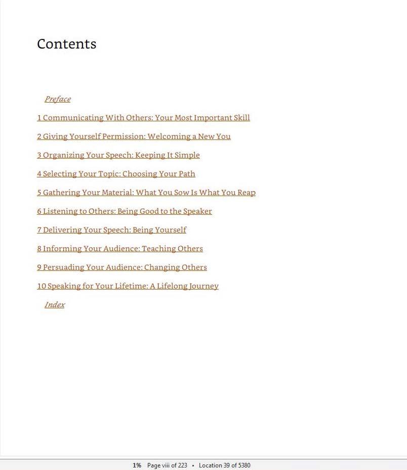 And Chapter 10 invites you to become a speaker for your l ife t ime. Impromptu speakin g, spec ia l occasion speaking, deve lo ping t he he art o f a speaker, a n d bal anc ing techno lo gy and communication are expla i ned in a s imple and encouraging way.