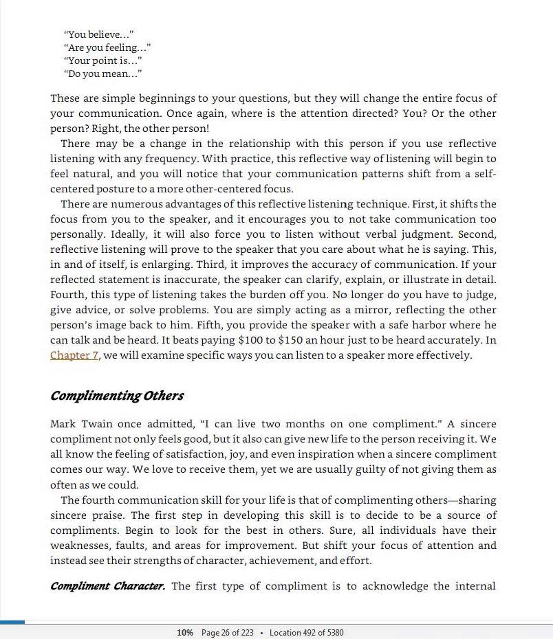 Ther e are numerous advan tages of this reflective li stening tec hni q ue. First, it s hi fts the focus from you to the speaker, and it encourages you to not take communication too personally. Ideall y, it w ill a lso force yo u to listen w ithou t verbal judgment. Se cond, reflective listening w ill pro ve to t he speaker th at you care about w h at he is saying. Thi s, in and of i tse lf, is enlargi ng . Third, i t impro ves the acc ur acy of c ommunication. If yo ur reflected statement is in accurate, the speaker can clar ify, explain, or ill ustrate in detail. Fourth, this type o f li stening takes the burden off yo u . No lo nger do you h ave to judge, give adv ice , or so l ve prob lems. You are s impl y act ing as a mirror, reflecting t he other perso n 's im age back to him. Fift h, you provide the speaker wit h a safe h arbor w h ere he can talk and be he ard. It beats paying $100 to $15 0 an hour just to be he ard accurate l y. In Chapt er 7, we w ill examine spec ific ways yo u can li ste n to a speaker more effective ly.