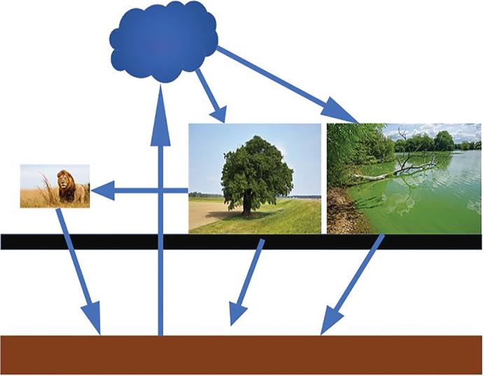 When plants and bacteria die, their organic constituents are dispersed in soils through decomposition by soil micro-organisms. That decomposition releases much of the CO2 they captured during photosynthesis making its way out of the soil to return to the atmosphere (Figure 1.1). This organic matter-soil decomposition cycle contributes CO2 output to overall soil respiration that includes respiration of plant root and flora and fauna that live in the soil. In addition to the contributions of plants, algae, and cyanobacteria to the carbon cycle through soils, there is a substantial sub-cycle that is related to contributions from animals. The animals consume CO2 in the form of food, with animal excrements and corpses returning to the soil and being decomposed along with plant, algae, and cyanobacteria remnants.
