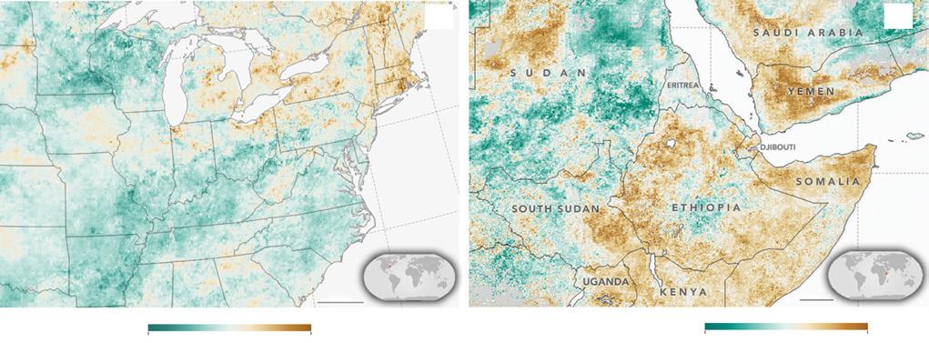 Figure 1.7 Evaporative Stress Index (ESI) derived from observations of land surface temperatures and leaf area index from the Moderate Resolution Imaging Spectroradiometer (MODIS) on NASA’s Terra and Aqua satellites and the Visible Infrared Imaging Radiometer Suite (VIIRS) of the Suomi National Polar‐orbiting Partnership (NPP). (a) The drought in New England that put crops and businesses under stress. (b) The drought that reduced food production and increased famine in the Greater Horn of Africa. (Courtesy: NASA’s earth observatory: https:// earthobservatory.nasa.gov/images)