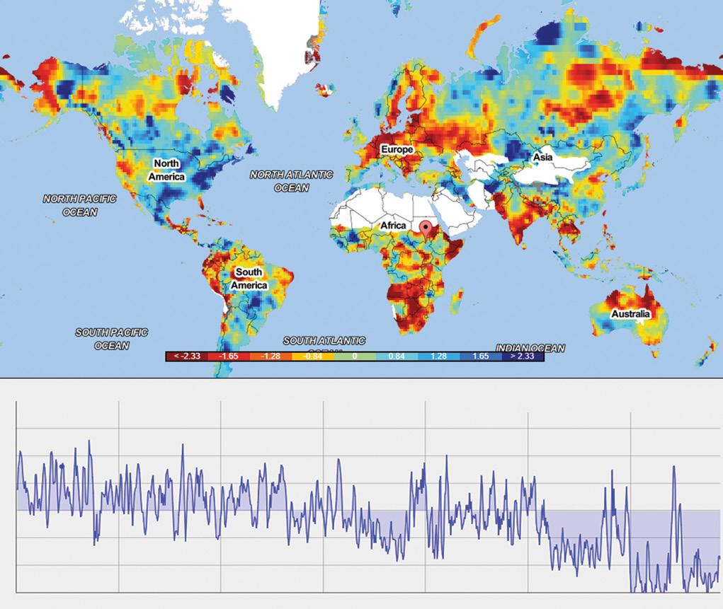 Figure 1.6 Three‐month Standardized Precipitation Evapotranspiration Index (SPEI) with 1° spatial resolution. (a) Global view of SPEI for November 2018. (b) Time series of SPEI for 9.25° E and 31.25° S in Africa. (Source: The Standardized Precipitation Evapotranspiration Index (SPEI), http://spei.csic.es/map/maps.html)