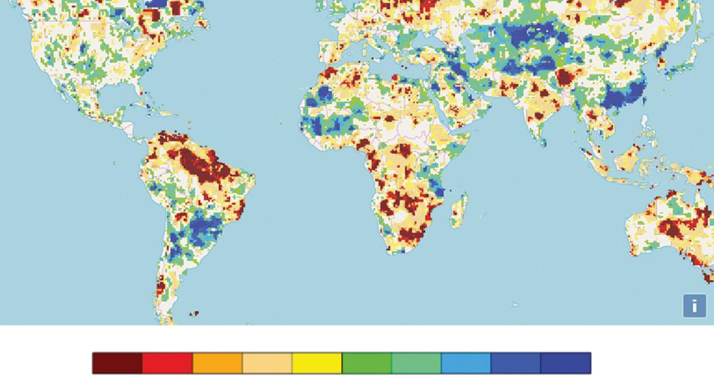 Figure 1.3 Near real‐time drought monitoring and prediction system by the Global Integrated Drought Monitoring and Prediction System (GIDMaPS) using the Standardized Soil Moisture Index (SSI) for February 2016 based on the Modern‐Era Retrospective analysis for Research and Applications (MERRA) data set. D0 indicates abnormally dry; D1 moderate drought; D2 severe drought; D3 extreme drought; D4 exceptional drought; and the same applies to wetness (W) scale.