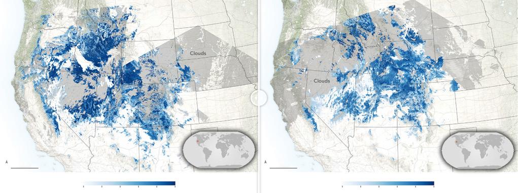 Figure 1.8 A below‐normal snowpack observed by the Moderate Resolution Imaging Spectroradiometer (MODIS) on NASA’s Terra satellite. (a) Percent of fractional snow cover on 25 January 2016. (b) Below normal conditions in 29 January 2018. (Courtesy of NASA’s earth observatory: https://earthobservatory.nasa.gov/images)