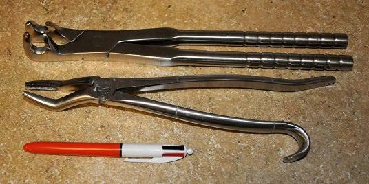 Dental extractions in horses have been performed and described for many centuries. Initially, this was performed by striking accessible teeth, such as wolf teeth, directly. “With the horse’s head tied up high, and his mouth opened wide, take a carpenter’s gouge, place the edge at the foot of the wolf tooth, turn the hollow side downwards, holding your hand steady so that the tool may not swerve or slip, then strike the head of the tool a good stroke wherein you may loosen the tooth and bend it inwards, then wrench the tooth out with the hollow side of the tool. Then fill up the empty hole with salt finely brayed.” Trephining was developed as a means of opening the frontal and maxillary sinuses for treatment of nasal diseases caused by glanders or sometimes by dental disease by Lafosse in 1749.