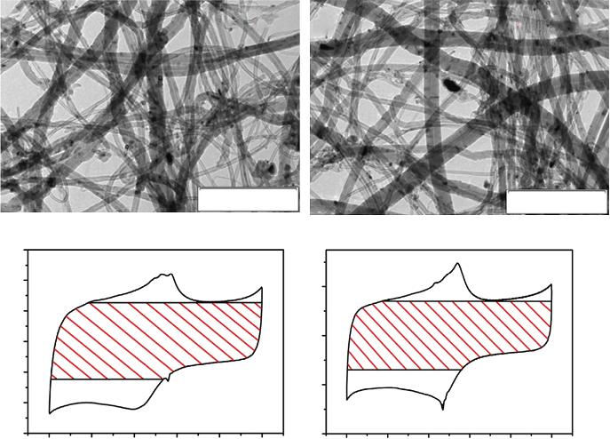 Figure 1.3 (a, b) HRTEM images of multi-walled carbon nanotube (MWNTs) synthesized at different temperatures, (c–d) CV curves at 20 mV s−1 rate in 1 M H2SO4 aqueous electrolyte, respectively [30]. Copyright 2016. Reproduced with permission from John Wiley & Sons.