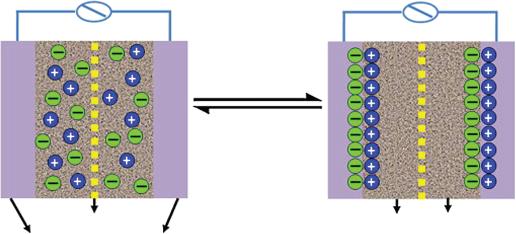 Starting from the theory of interface double electric layer proposed by Helmholtz, a German physicist, EDLCs began to be developed gradually. When two electrodes are inserted into the electrolyte, the positive and negative ions in the electrolyte will move towards the two poles rapidly under the action of the electric field, and attach to the electrode surface, forming a compact double electric layer [6]. As shown in Figure 1.1 [7], in the charging process, the applied electric field releases electrons, and the direction of electrons is from the negative electrode to the positive electrode. At this time, the ions present in the electrolyte will transport towards the respective electrodes respectively, so as to adsorb on the electrode surface and form a stable voltage. In the process of discharge, electrons flow through the conductor to generate current, at this time, the anion and cation on the electrode surface will be released into the electrolyte. In this process, the electrode material will not react with the electrolyte, only the adsorption and desorption of anions and cations in the electrolyte on the electrode surface [8, 9].
