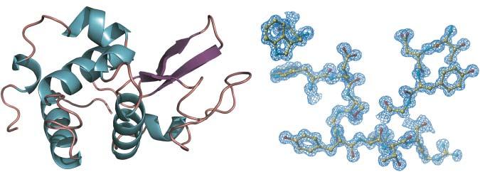 Figure1.3 X-raydiffractionstructureofcrystallinehumanlysozymepreparedbytotal chemicalsynthesis.(a)Cartoonrepresentationofthesecondarystructureofthefolded humanlysozymesyntheticproteinmolecule;(b)2Fo F c electrondensitymap,showingthe qualityofthedataacquiredataresolutionof1.04Å.Source:Dureketal.[11].©2007 NationalAcademyofSciences.