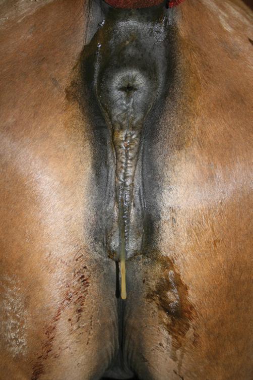 Figure 2.1 Mare in estrus (i.e., teasing in heat). Note the base-wide stance, raised tail, and urination.