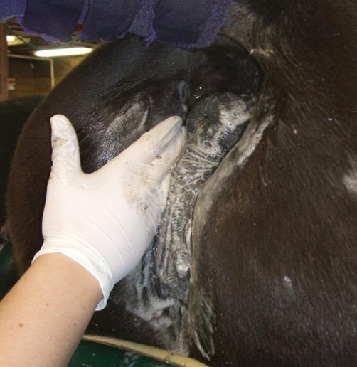 ● If a flexible elastic wrap is used such as Vetrap™, the wrap may either be used to wrap the entire tail or the upper portion (Figure 3.3). The entire tail is wrapped for a dystocia or a fetotomy to prevent tail hairs from interfering with the procedure. To place the entire tail in a wrap, fold the tail hairs so that the hairs do not extend beyond the tail stump. Wrap the elastic wrap around the tail/tail hairs so that no hair is visible along the entire tail length. This in effect creates a “club” with the tail wrapped completely.