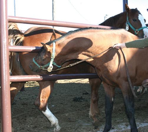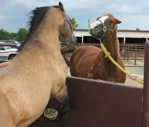 Figure 2.2 Mare in diestrus (i.e., out of heat) on far side of teasing wall. Note the ears and aggressive stance.