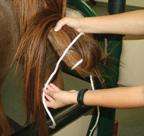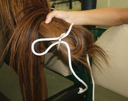 commissure of the vulva. Technique one is to start at the top of the tail and with every circumferential wrap, flip some tail hairs upward so that they become trapped between successive layers (Figure 3.1). This prevents the tail wrap from slipping down the tail. This tail wrap